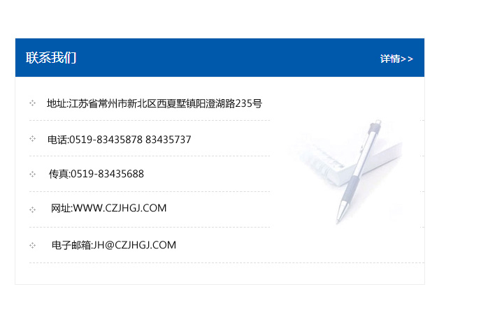 地址:常州市新北區友邦商務大廈1幢16、17層  電話:0519-85101652  傳真:0519-85112595  郵編:213022  網址:www_cz-jiayue_cn.lyltsc.com  郵箱:xiajifengaa@163.com